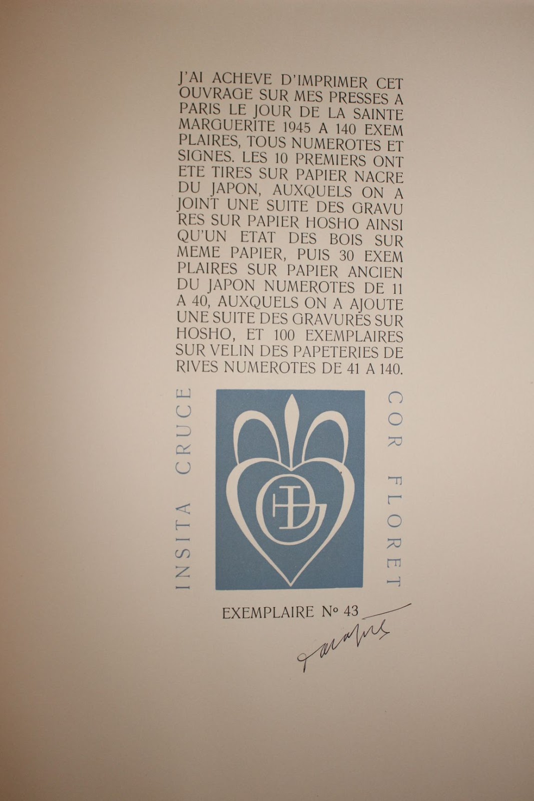 Tirage unique à 140 exemplaires, un des 100 exemplaires sur papier vélin (n°43) portant la signature de Daragnès à la justification. Cet ouvrage est illustré de 57 bois originaux de Daragnès et a été édité directement par l'atelier de Daragnès. Il semble que ce soit la première édition de la traduction de Claudel.